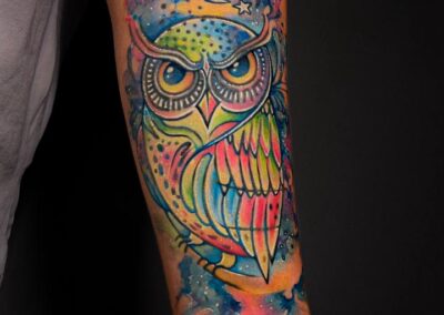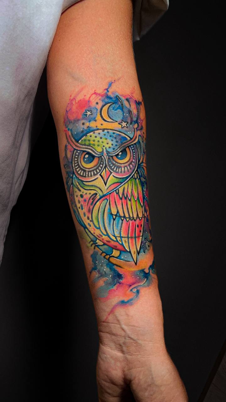 Farbenfroh und weich: Tattoos in diesem Stil arbeiten mit klecksartigen Farbflächen, die Schriftzüge, Symbole oder skizzenhafte Motive umspielen. Sie sind meist in leuchtenden Pastelltönen gehalten, die an Wasserfarben erinnern. Bei diesen Tattoos sind die Übergänge sanft, die Farbe sollte leicht verlaufen wirken.